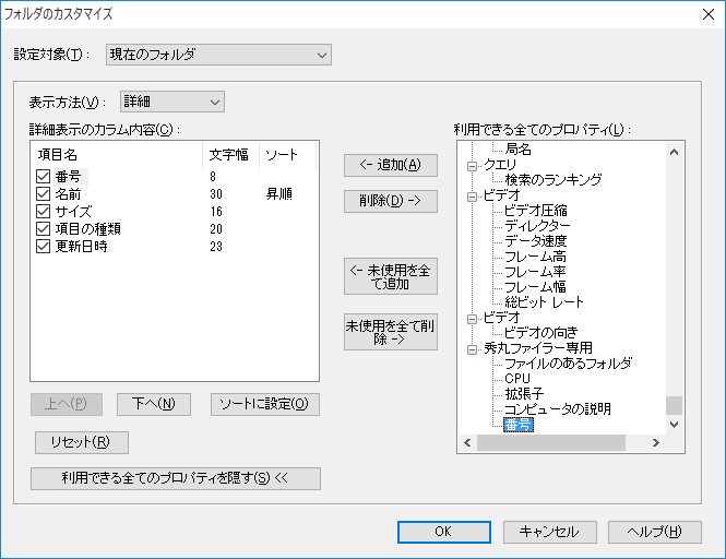 詳細表示の列をカスタマイズして、推定エンコーディングを表示できます。