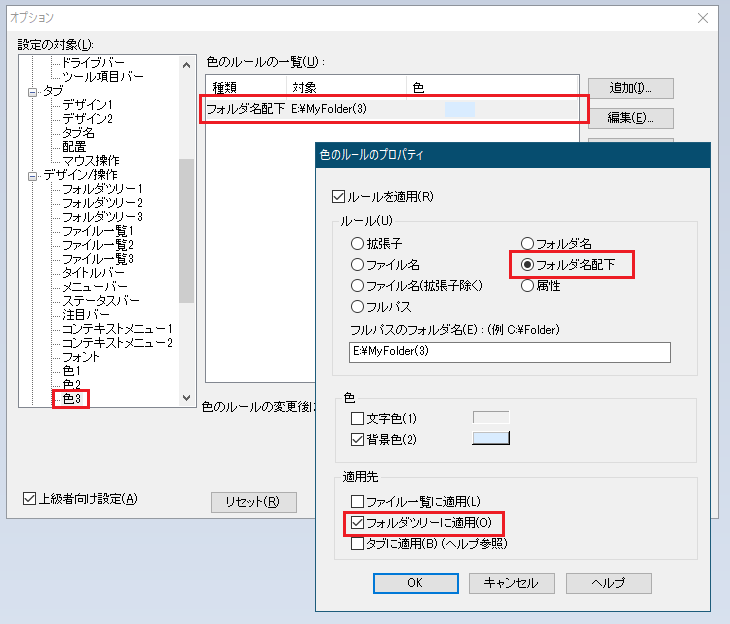 オプションの「デザイン/操作」の「色3」で詳細なルールに従った色付けの指定で、フォルダツリーやタブなどにも適用できます。