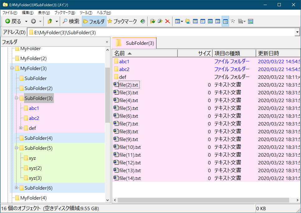 ファイルやフォルダや拡張子など別々の色を付けることができます。
