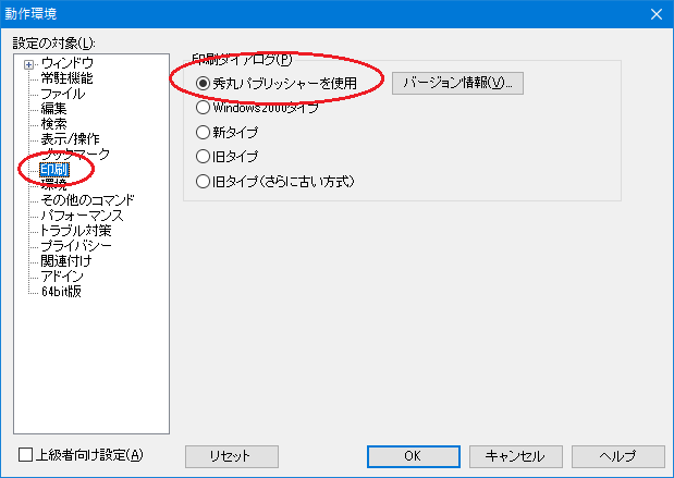秀丸パブリッシャーをインストールしたら、「その他 - 動作環境...」の「印刷」ページにて印刷ダイアログに秀丸パブリッシャーを指定する必要があります。秀丸メール単品をお使いの場合は「設定 - 秀丸エディタの動作環境...」から同様の設定を変更してください。