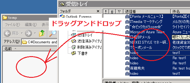 - Outlook Expressを起動して、先ほどの「temp」フォルダとOutlook Expressのウィンドウの両方が見える状態にする。(ドラッグアンドドロップをやりやすい用に)