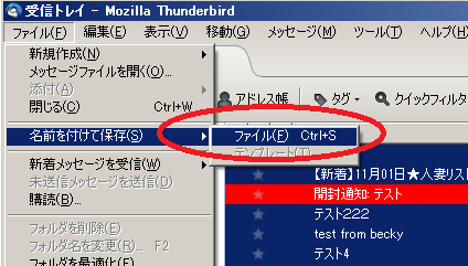 Thunderbirdのメールデータを一時フォルダにエクスポートするには、メールをすべて選択してから「ファイル・名前を付けて保存・ファイル」のコマンドを実行する形になります。それで保存先フォルダを指定すると、Outlook Expressでドラッグアンドドロップした時のように、「1メール1ファイル形式」でエクスポートされます。あとはそのファイルを秀丸メールに、同じく「1メール1ファイル形式」でインポートすればいいです。
