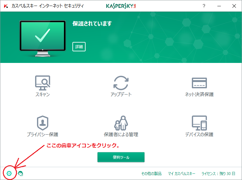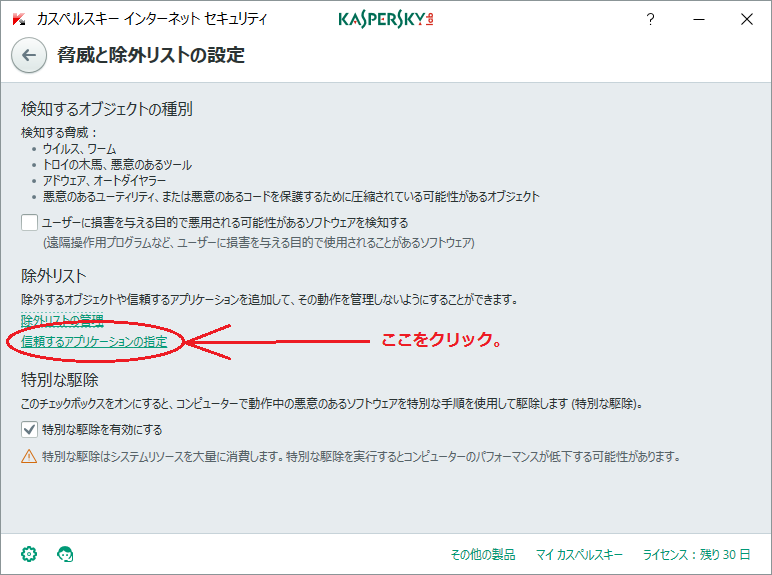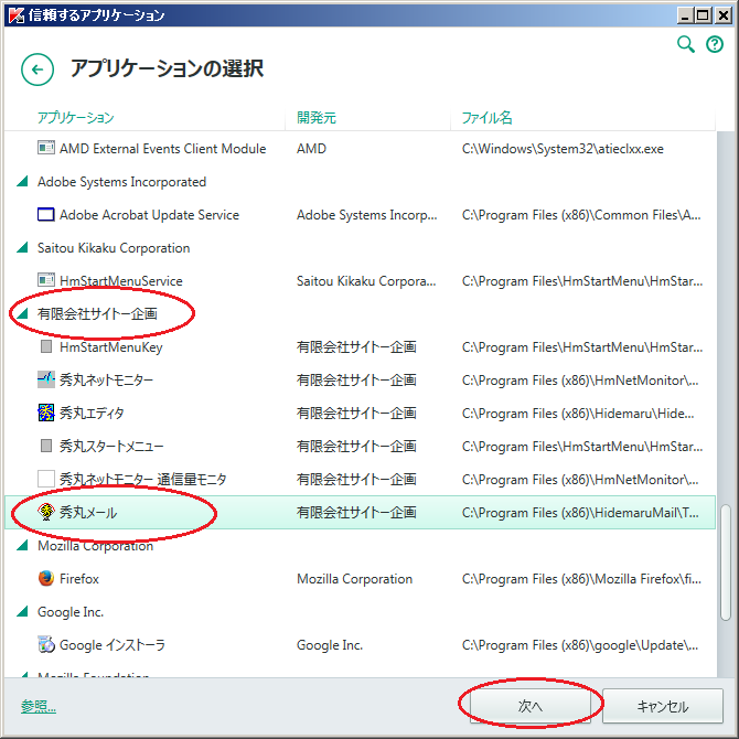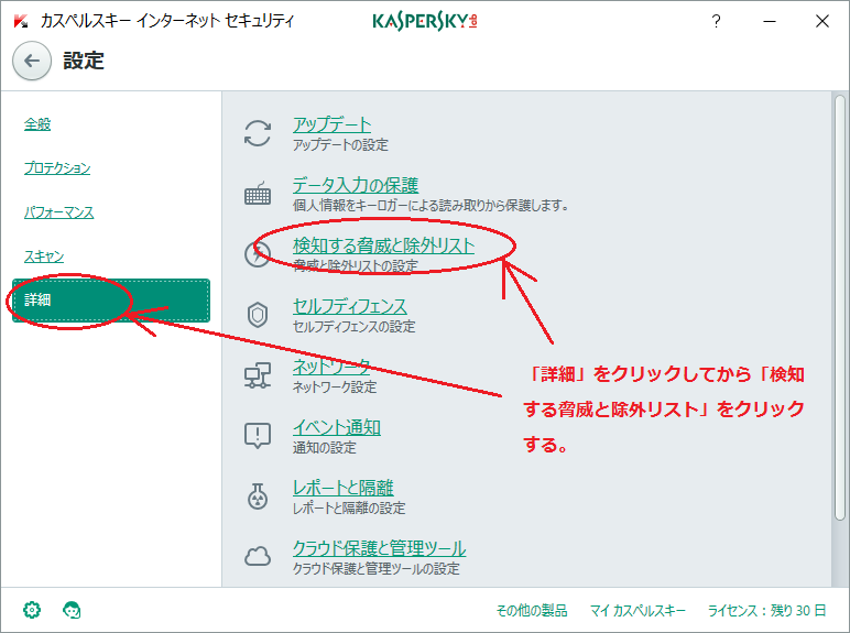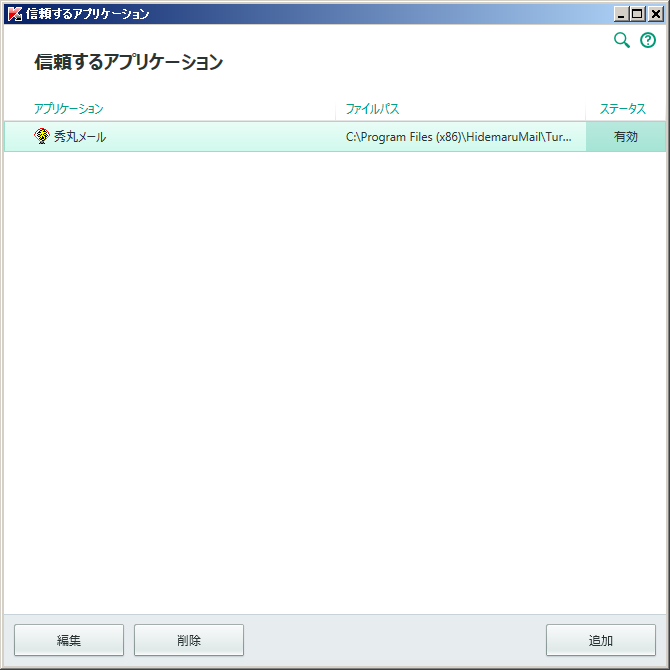 タスクバーのトレーからカスペルスキーさんのウィンドウを呼び出す。 左下にある歯車アイコンをクリックする。 ![]() 「詳細」の中の「検知する脅威と除外リスト」をクリックする。 ![]() ![]() ![]() アプリケーションの一覧の中に秀丸メールがあるはずなので、それを選択して「次へ」を押す。 ![]() 「アプリケーションの動作を監視しない」だけONにして「保存」を押す。 ![]() 秀丸メールが登録されてればOK。右上の「×」を押すなどして設定を終了する。 ![]() 『戻る』 |
