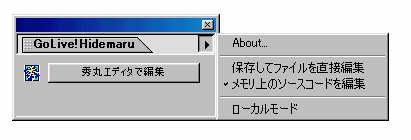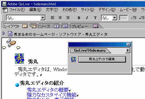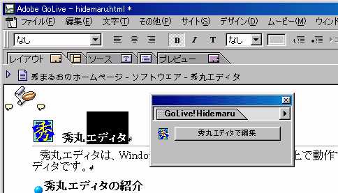 | ■ 秀まるおのホームページ(サイトー企画) > ソフトウェア > 過去のソフトウェア > GoLive! Hidemaru > GoLive+秀丸エディタで最高のソリューションを! |