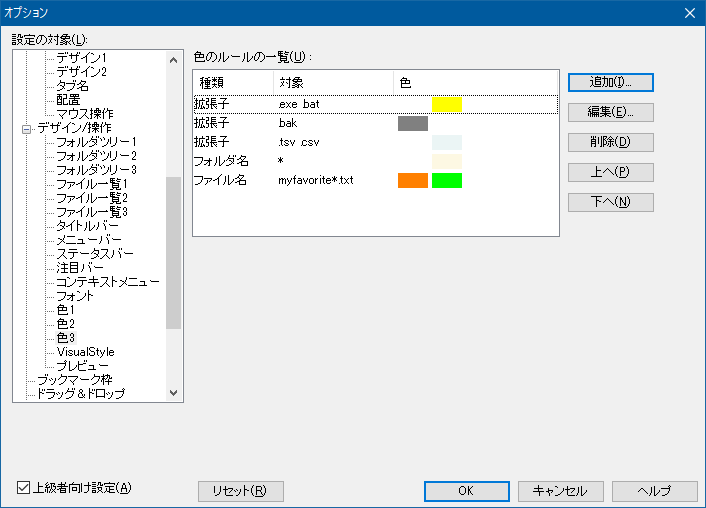 オプションの「デザイン/操作」の「色3」で詳細なルールに従った色付けの指定で、フォルダツリーやタブなどにも適用できます。