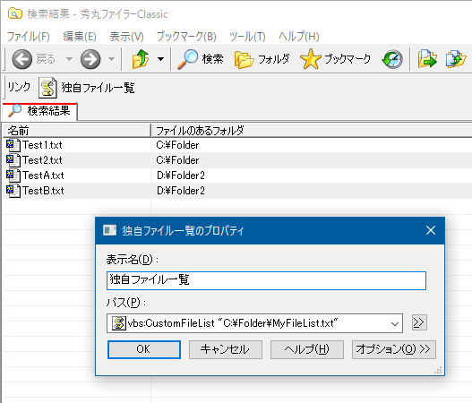 スクリプトのCustomFileListメソッドを使って、テキストファイルに書かれたファイル名の一覧を元にして、検索結果のようなファイル一覧枠を作成できます。