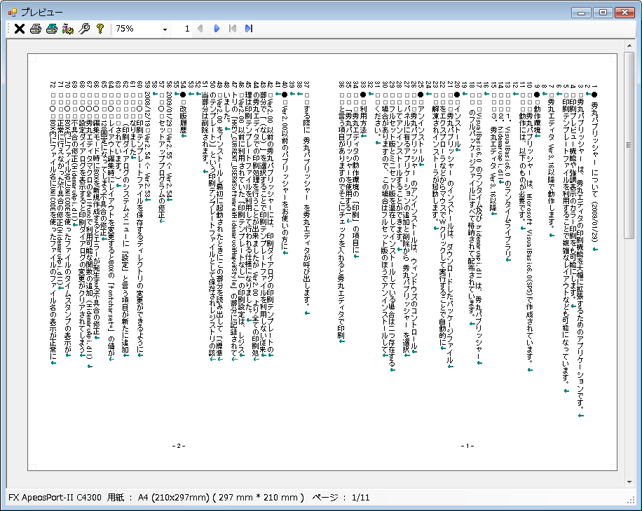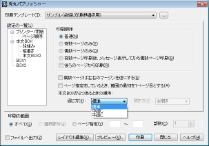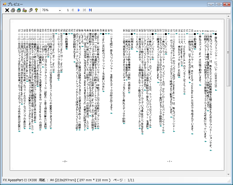 以前までのバージョンでは、単純に一枚の用紙に1ページを印刷するのみでしたが、印刷テンプレートに複数の本文BOXが配置可能になったVer4.00では、「袋綴じ印刷」「中綴じ印刷」「平綴じ印刷」等の製本用の印刷が行えるようになりました。