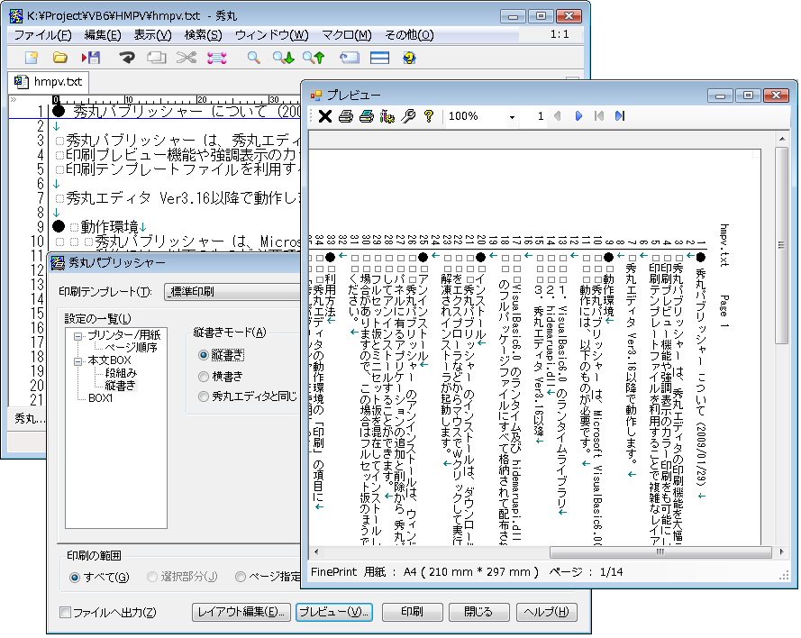 秀丸パブリッシャーのVer4.00から、強制縦書き印刷機能もサポートされました。