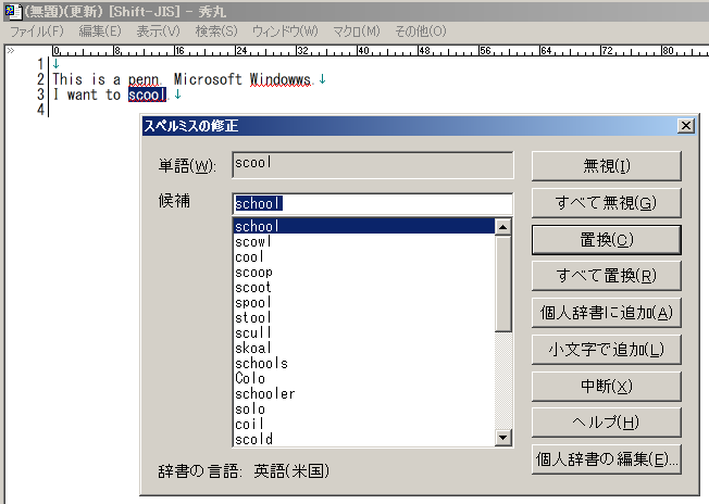 秀丸エディタの場合、「表示」メニューの「自動スペルチェック」のコマンドを実行して自動スペルチェックをONにすると、スペルミスした単語が波線付き表示されるようになります。さらに、「その他」メニューの「スペルミスの修正...」コマンドを実行すると、カーソル位置から下方向にスペルミスの単語を探してそれの修正候補の一覧を表示して修正が可能です。