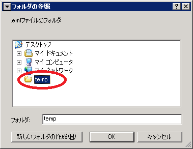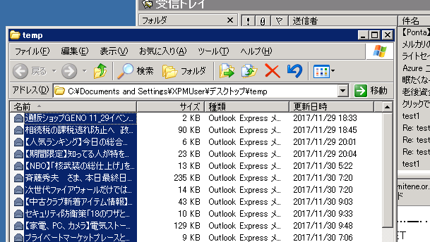 - Outlook Expressを起動して、先ほどの「temp」フォルダとOutlook Expressのウィンドウの両方が見える状態にする。(ドラッグアンドドロップをやりやすい用に)