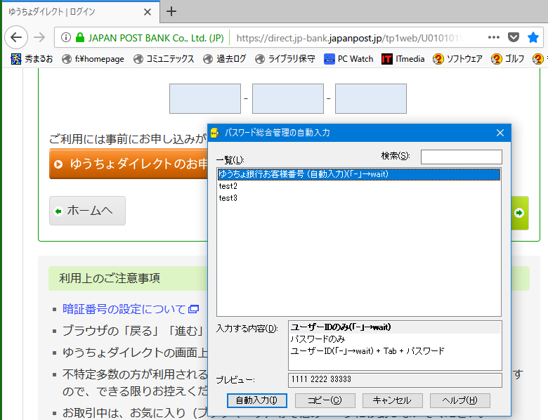 - 自動入力のダイアログボックスが出てくるので、ここでゆうちょ銀行の項目を選択してEnterする。